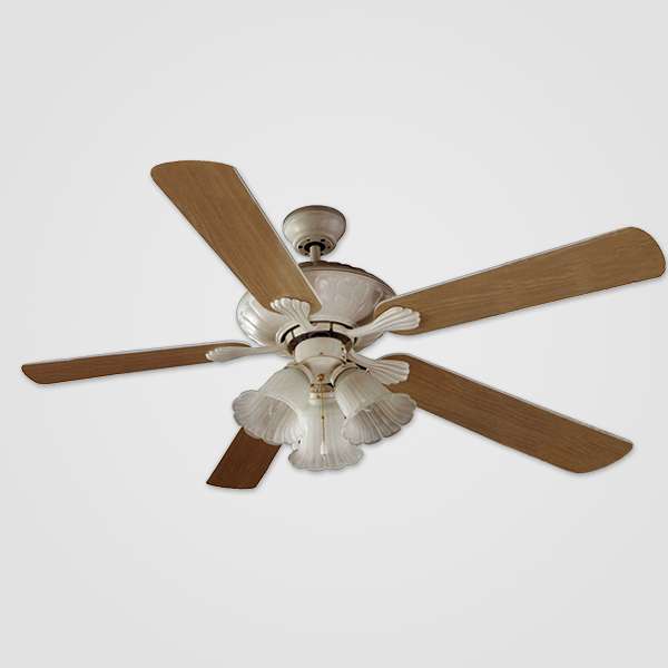 52″ Traditional Ceiling Fan with 5 blades reversible oval ends and three floral shades light.